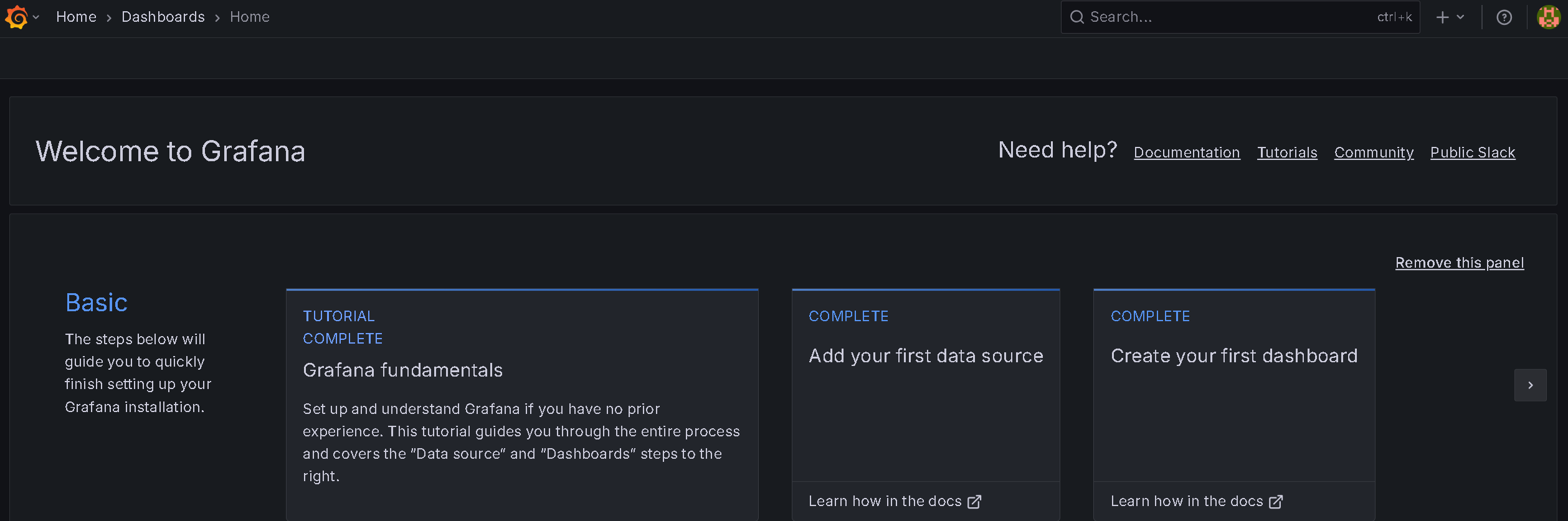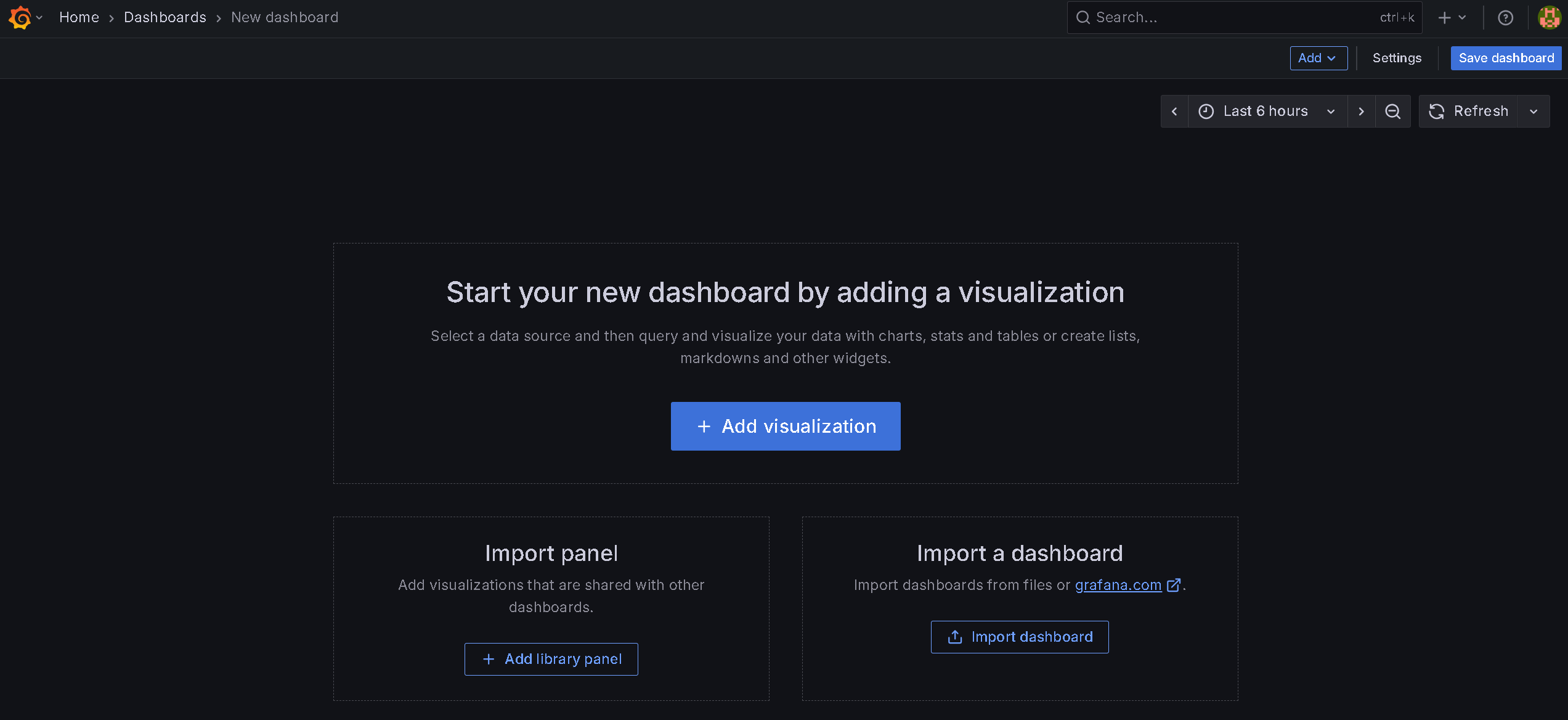 Go back to Grafana home page and click the tile: Create your first dashboard.